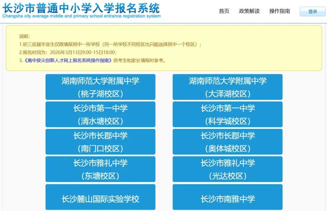 报名办法:浏览器打开网址进入系统后,先登录(建议用常用手机号,以便后续接收信息)。再返回首页,点击“高中拔尖创新人才报名”(正式开放后才可见),选择目标学校即可进入报名页面。注意:城区学生可以任选一所学校报名;长沙县毕业生可填报湖南师大附中(桃子湖或大泽湖校区);浏阳市可填报长郡中学(南门口或奥体城校区);宁乡市可填报雅礼中学(东塘或光达校区)。