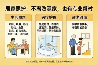 长辈大多念旧,舍不得住了一辈子的家。我们把护理站搬进社区,打造15分钟便民服务圈,足不出户就能享受到贴心陪护👇