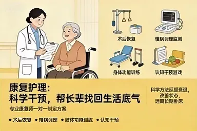 专业康复师一对一制定方案,针对术后恢复、慢病调理、肢体功能训练、认知干预等场景,用科学方法延缓身体衰退,帮助长辈改善状态,尽量远离长期卧床困扰。