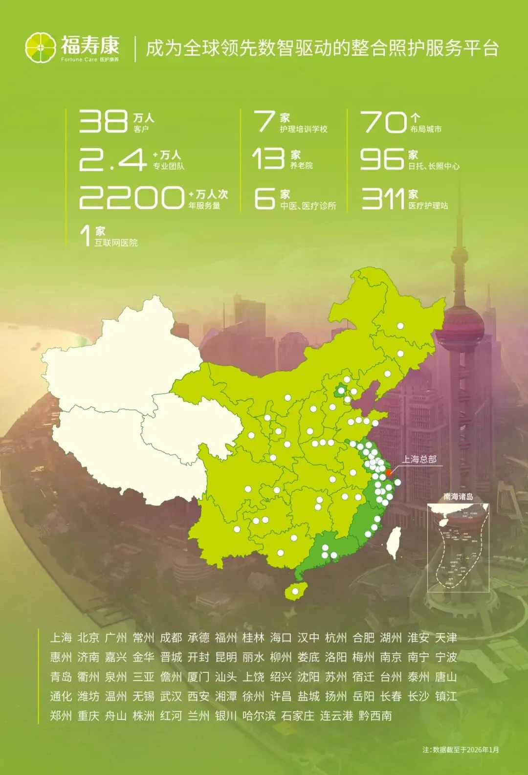 背靠福寿康十余年医养经验,覆盖全国60+城市,有成熟的服务标准和质控体系,每一步服务都有章可循,品质更有保障。