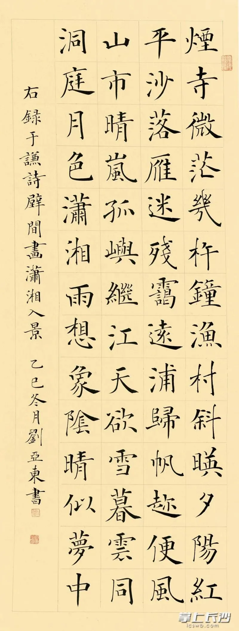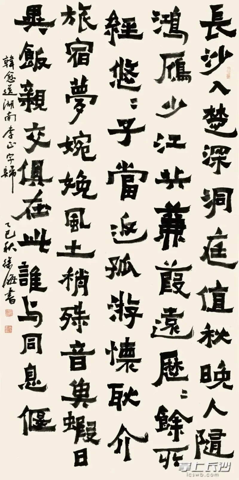 本次展览以“守正创新”为理念,精选古今名人咏颂湖湘的诗文佳作,通过融合楷书艺术的严谨笔触与时代精神的创新表达,呈现湖湘精神的文学厚度与艺术张力。来自全国书坛的100位楷书精英,以中堂、条幅、斗方、扇面等形式,将经典诗文与楷书艺术完美融合。在这里,你既能看到楷书的正大气象,也能感受到书法家们在“守正”基础上,对时代精神的深刻感悟与“借古开今”的创作追求。