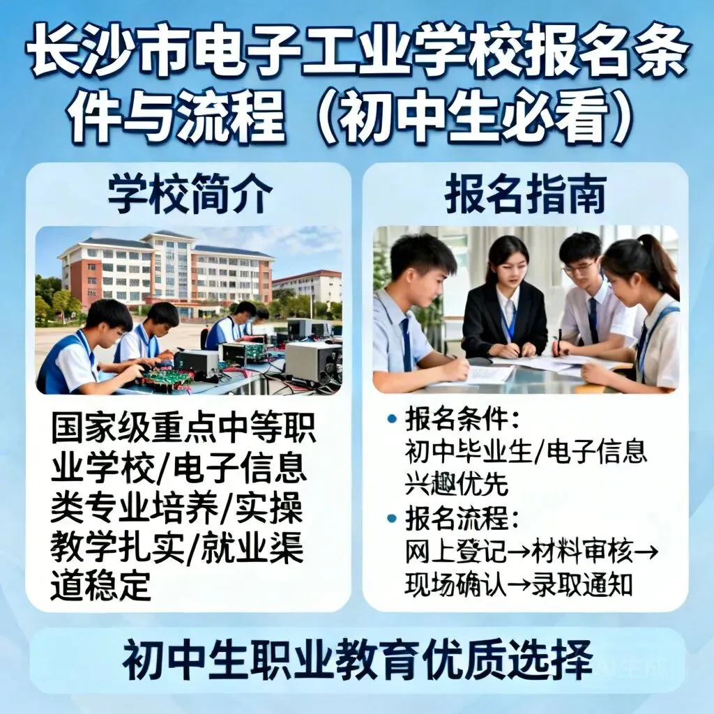 长沙市电子工业学校是国家级重点中等职业学校,扎根长沙职业教育沃土,专注电子信息类专业培养数十年,以扎实的实操教学、稳定的就业渠道,成为众多初中毕业生转向职业赛道的优质选择。对于意向报考的初中生来说,摸透报名条件与流程,是成功入学的核心前提。