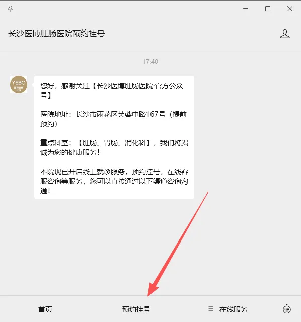 1.点击下方公众号名片或直接在微信搜索“长沙医博肛肠医院”公众号