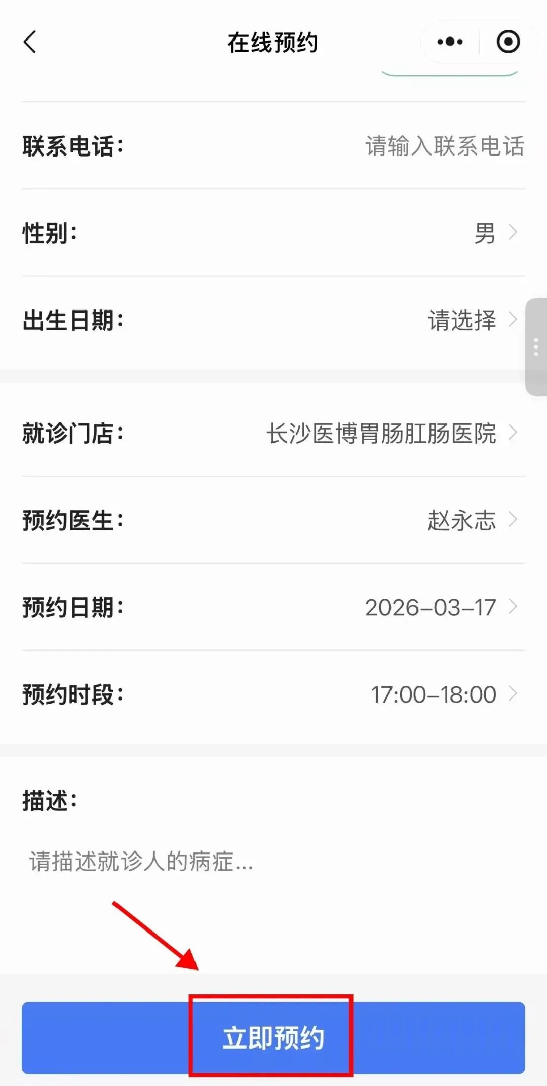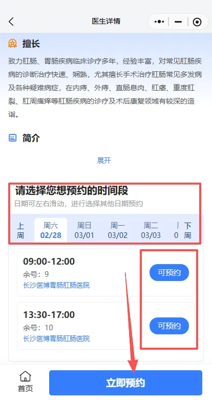 4.选择医生以及预约时间后:点击“立即预约”