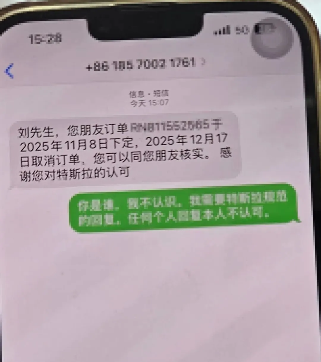 △长沙河西特斯拉中心的回复短信 受访者供图