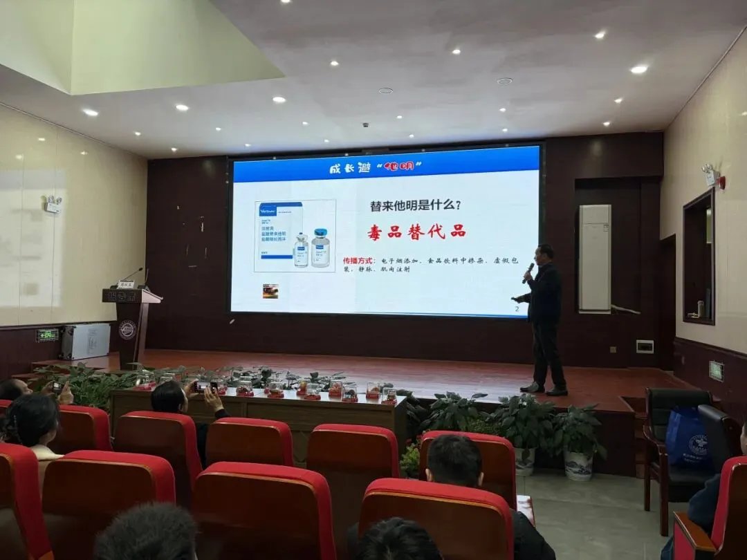 讲座围绕传统毒品、新精神活性物质、药物滥用、毒品替代品等内容,用专业、直观、震撼的讲解,为师生们送上一堂生动的青春防毒教育课。