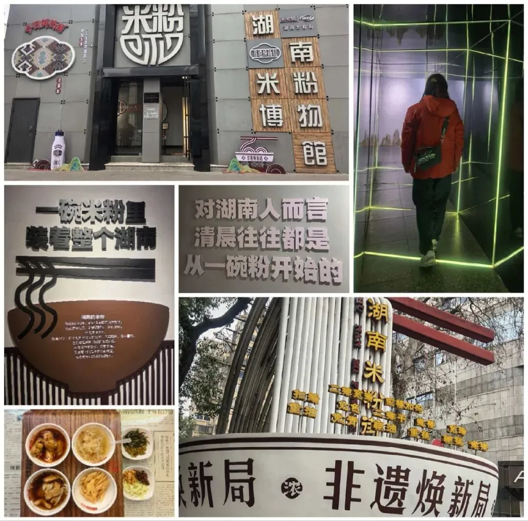 下午歇够了,去了很有意思的湖南米粉博物馆。长沙真的处处是惊喜,连嗦粉都能有一座专属博物馆。馆不大,却把湖南 14 个州市的米粉文化都装了进去,一间房一个地区,设计简单又用心,把传统米粉文化,讲得新潮又不刻板。逛完出门就是米粉店,必须来一碗尝尝,还好点了小份,不然真的吃不完。本来计划沿着米粉街 citywalk,结果一查晚上要吃的店-笨萝卜,已经排了一百多桌。打车半天不来,我们干脆扫了共享电瓶车 ——笑着说:“我们真是,到哪个城市都要骑电瓶车。”一路骑到路口,再飞奔过去取号,我还碎碎念:“这么拼,要是不好吃真的会伤心。”幸好没一道菜踩雷,尤其醋蒸鸡,香得很有友友鸡爪那味儿,越吃越上头。