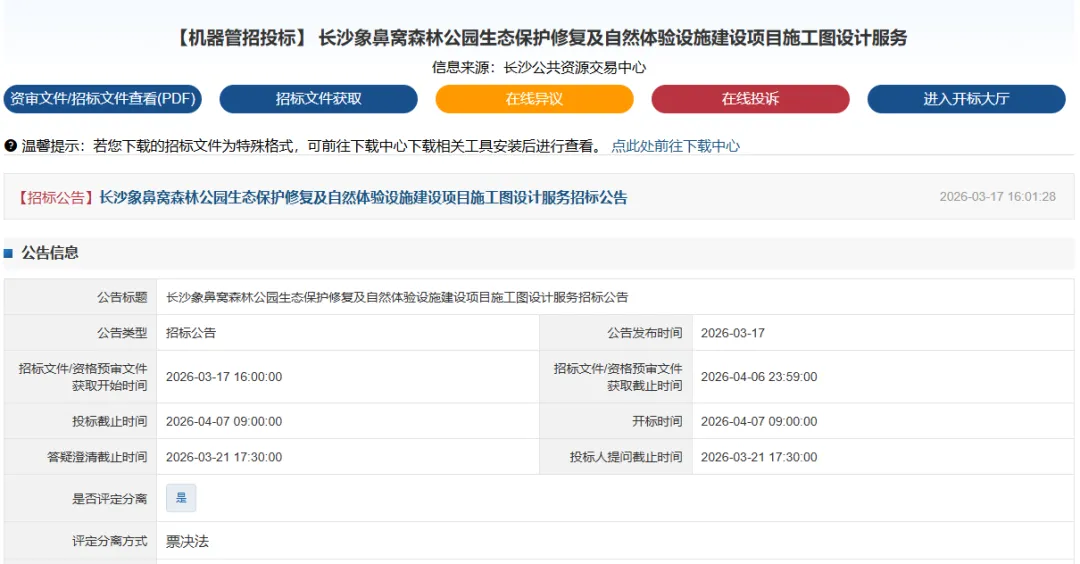 近日,官方发布“长沙象鼻窝森林公园生态保护修复及自然体验设施建设项目施工图设计服务招标公告”。