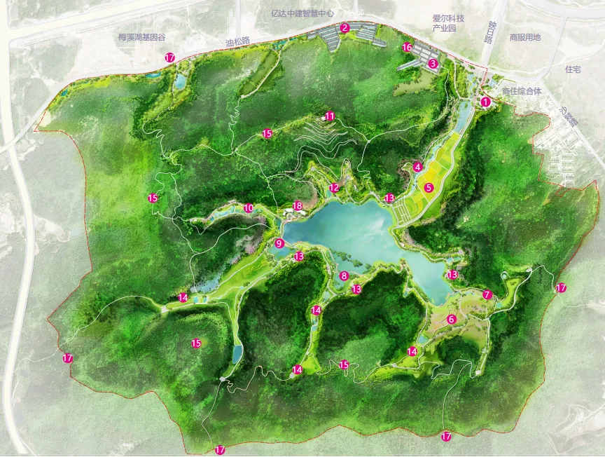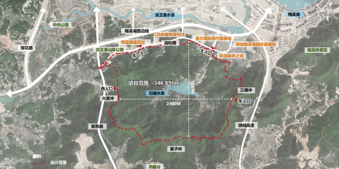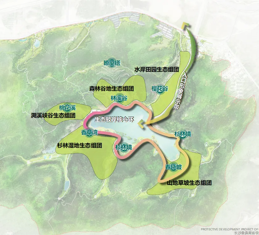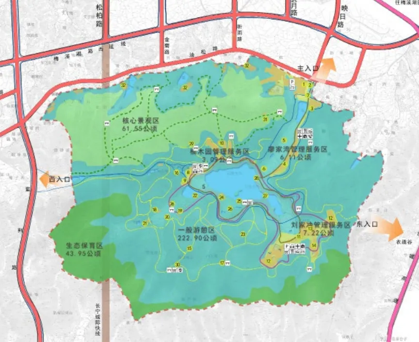 象鼻窝森林公园位于梅溪湖二期南侧,东邻桃花岭,西接莲花山,公园总面积344.89h㎡,共规划有4个出入口。