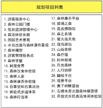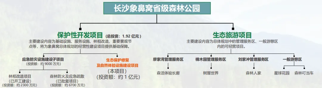 长沙象鼻窝省级森林公园分为保护性开发项目和生态旅游项目两个部分,其中保护性开发项目总投资1.92亿元,包括基础设施、服务设施、林相改造、重要景观节点等。