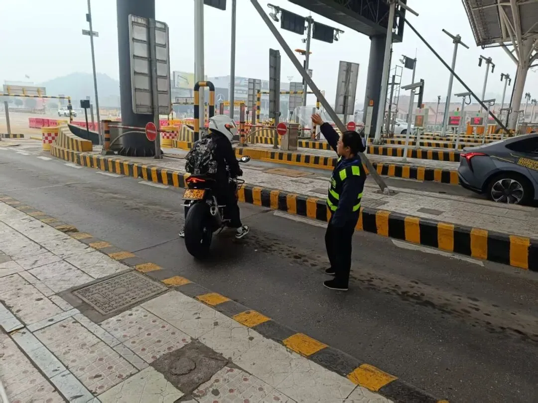 18时15分,正值晚高峰车流攀升期,一辆摩托车突然从入口匝道加速冲来,试图闯上高速公路。正在入口值守的伍剑辉立即上前,示意司机靠边停车。