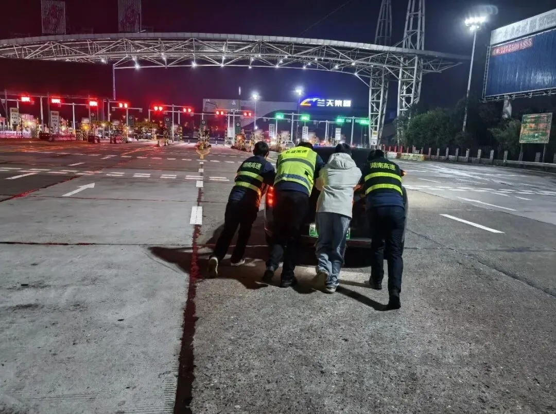 车主王先生自驾从湘西前往长沙,临近收费站时车辆电量告急,本想下高速后充电,谁知刚驶入收费广场,车辆就彻底断电抛锚。罗进得知后,迅速组织两名机动人员,在车辆后方布设安全警示,众人合力将车缓缓推至安全区域。