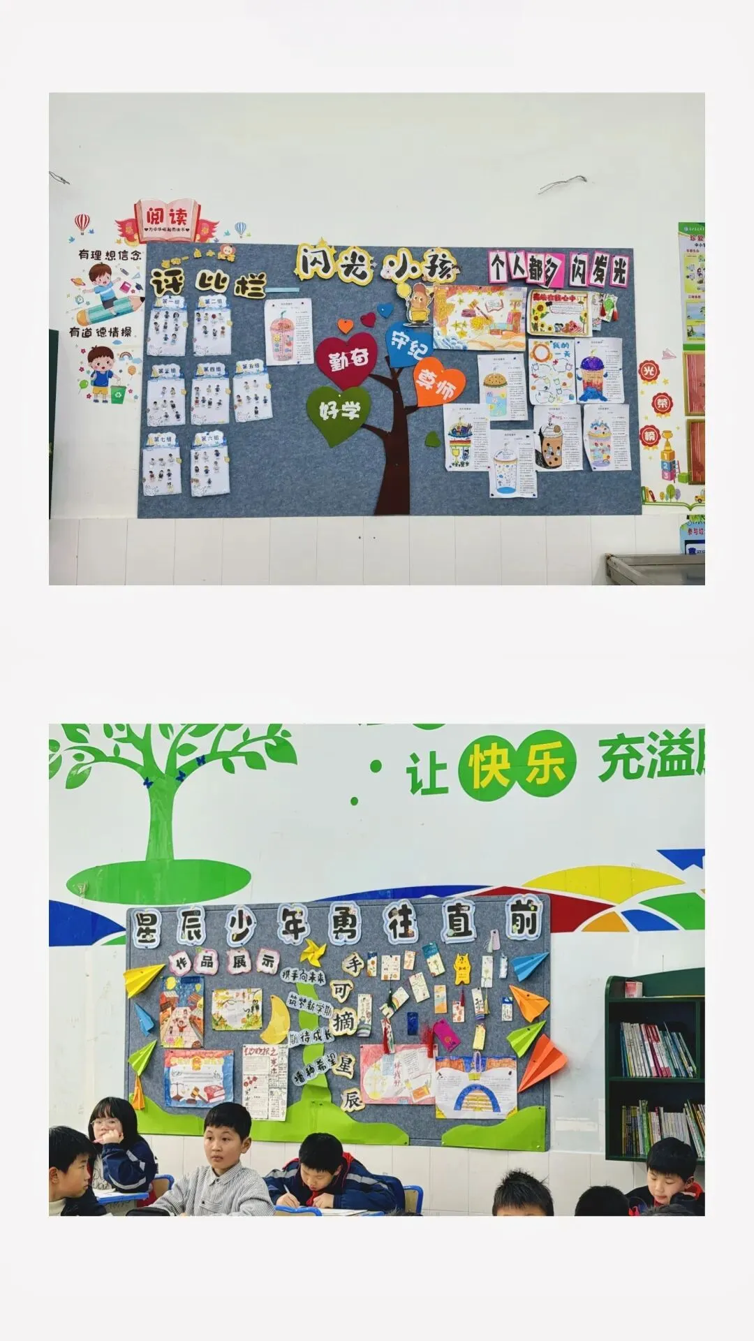 本次评比由德育处牵头,联合行政办、年级组长、美术组及值周老师组成评委组,从教室卫生、班务栏、图书角、中队角等多维度综合考评。检查中,各班均展现出良好风貌:地面洁净、桌椅整齐,黑板报主题鲜明、版面精美;多个班级打造出特色文化阵地,读书、剪纸等主题文化墙创意十足,图书角书籍丰富、布置精致,劳动工具房摆放有序,细节处尽显班级管理用心与文化底蕴。