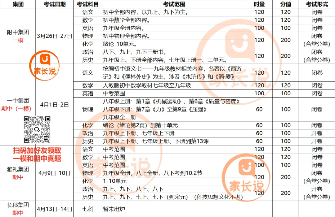 其中,一中集团的本次期中考试,同时也是中考一模;雅礼集团的一模时间预计在5月份。还提醒一下大家,长沙名高的重点班签约,通常参考一模、期中、二模等重要集团联考的成绩和排名。