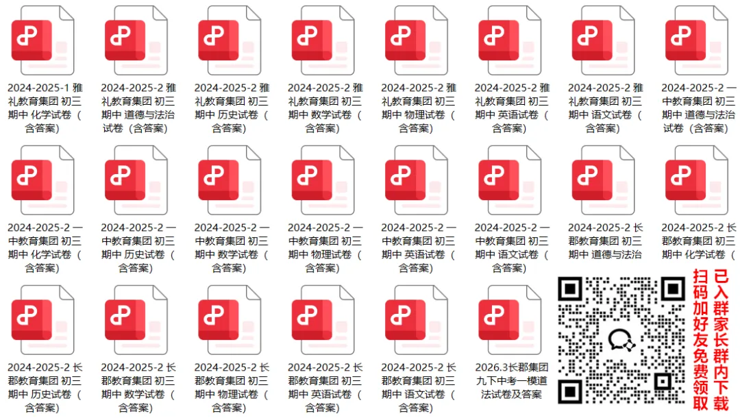 【联考真题】扫码进群可免费领取长沙四大名校集团初三一模+期中联考真题及答案,最新升学政策、招生报名信息、试题资料也会在群内发布(已入群家长直接在群内下载)。