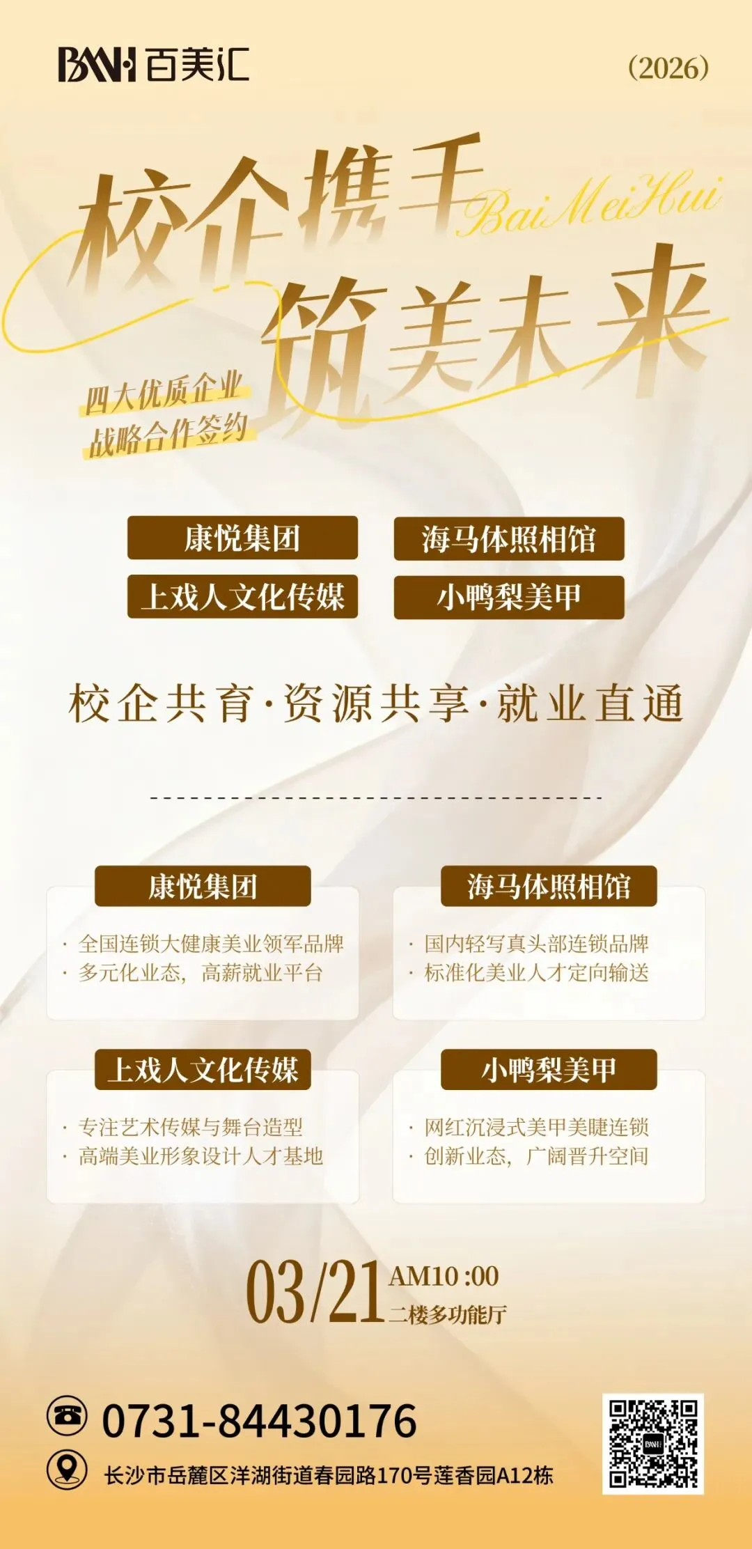 长沙百美汇将于3月21日(周六)10:00,在校园多功能厅(二楼)隆重举办2026年春季校企合作签约会。