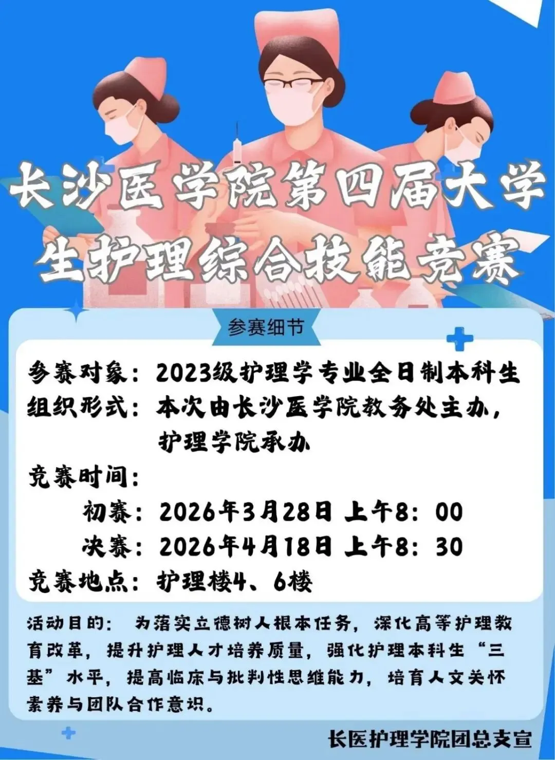 为落实立德树人根本任务,深化高等护理教育改革,提升护理人才培养质量,强化护理本科生“三基”水平,提高临床思维与批判性思维能力,培育人文关怀素养与团队合作意识。学校特开展2026年长沙医学院第四届大学生护理综合技能竞赛,期待各位护理学子在竞技中展现扎实功底,在协作中彰显护理温度!现将具体活动安排公布如下: