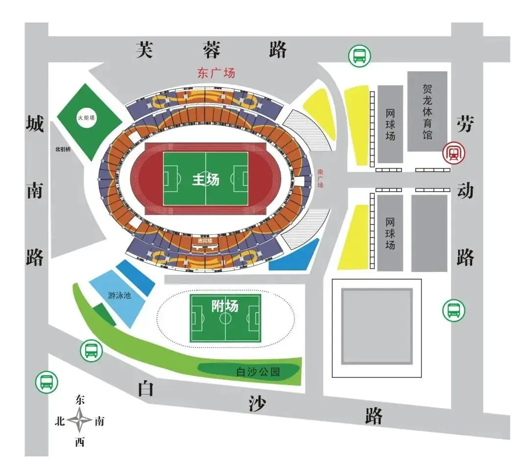* 大型赛事及文艺演出期间,贺龙体育场暂未设对外使用的停车区域,建议乘坐公共交通前往。