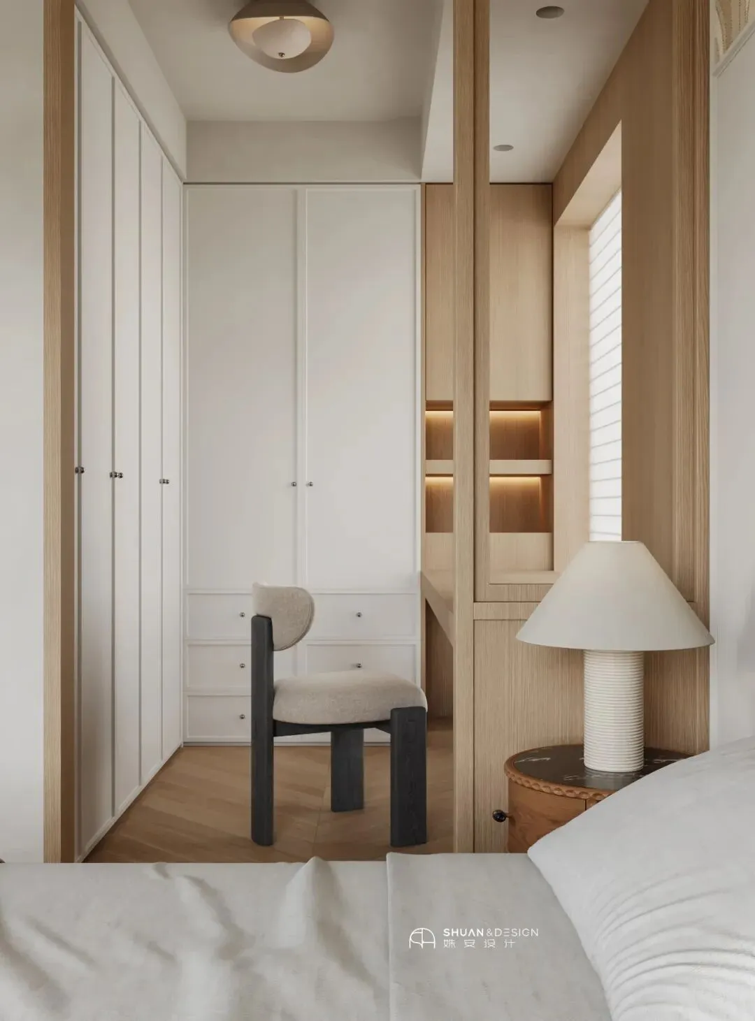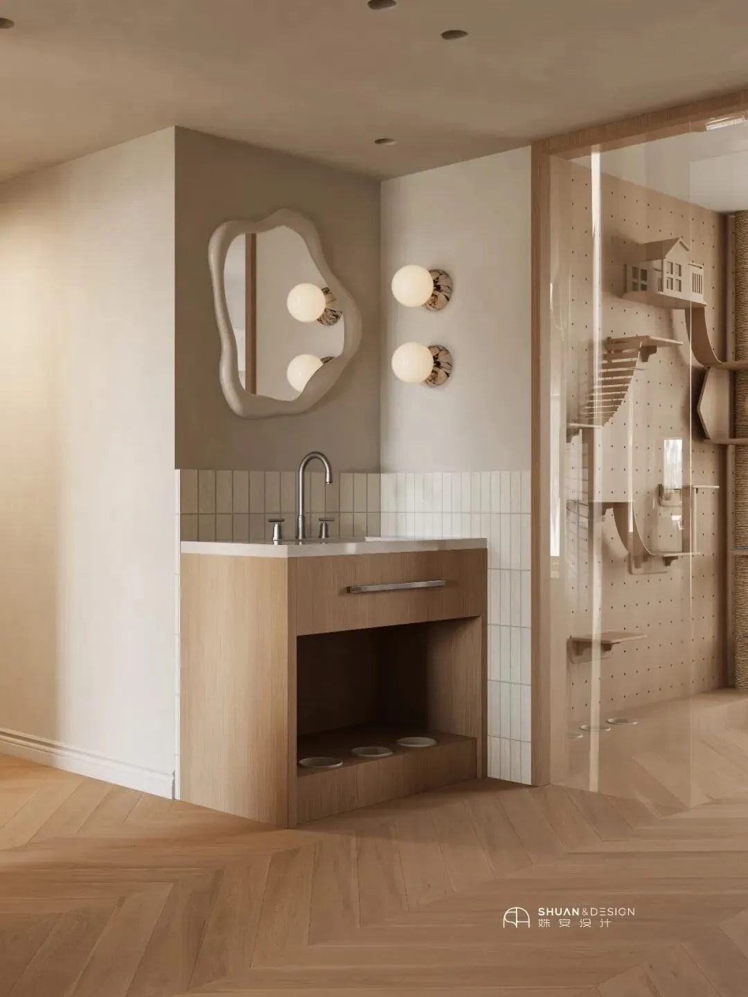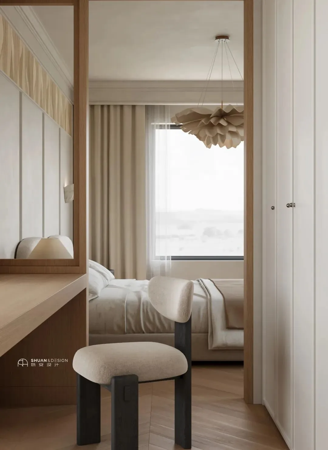 三分离是基本功,真正的亮点是那些「Pet-friendly」的细节。不规则的云朵镜,木质浴室柜,让洗漱变得温柔。而洗手台下方那个预留的猫碗位置,让铲屎官在刷牙时,也能和爱宠共享清晨。最高级的爱,是习惯里有你——「Always with You」。卧室 | 把梦,种在花里