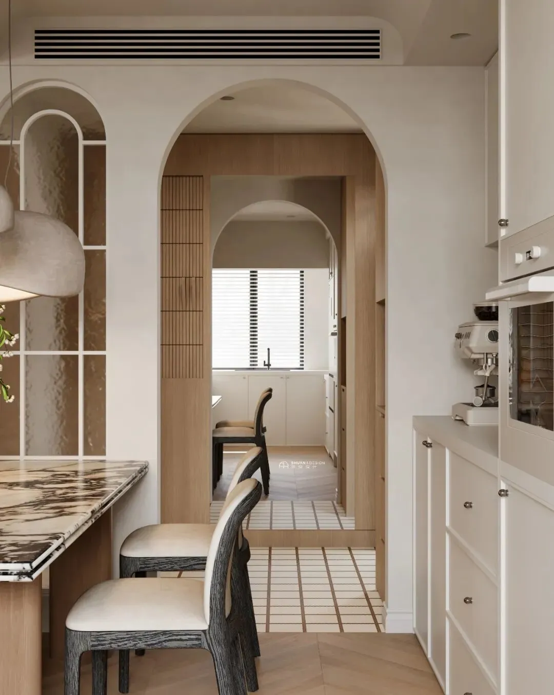 入户的拱形门洞,是家与外界的温柔结界。脚下复古的格子砖,提醒你:卸下一身风尘,切换回柔软的「Private Mode」。04 / Private Sanctuary