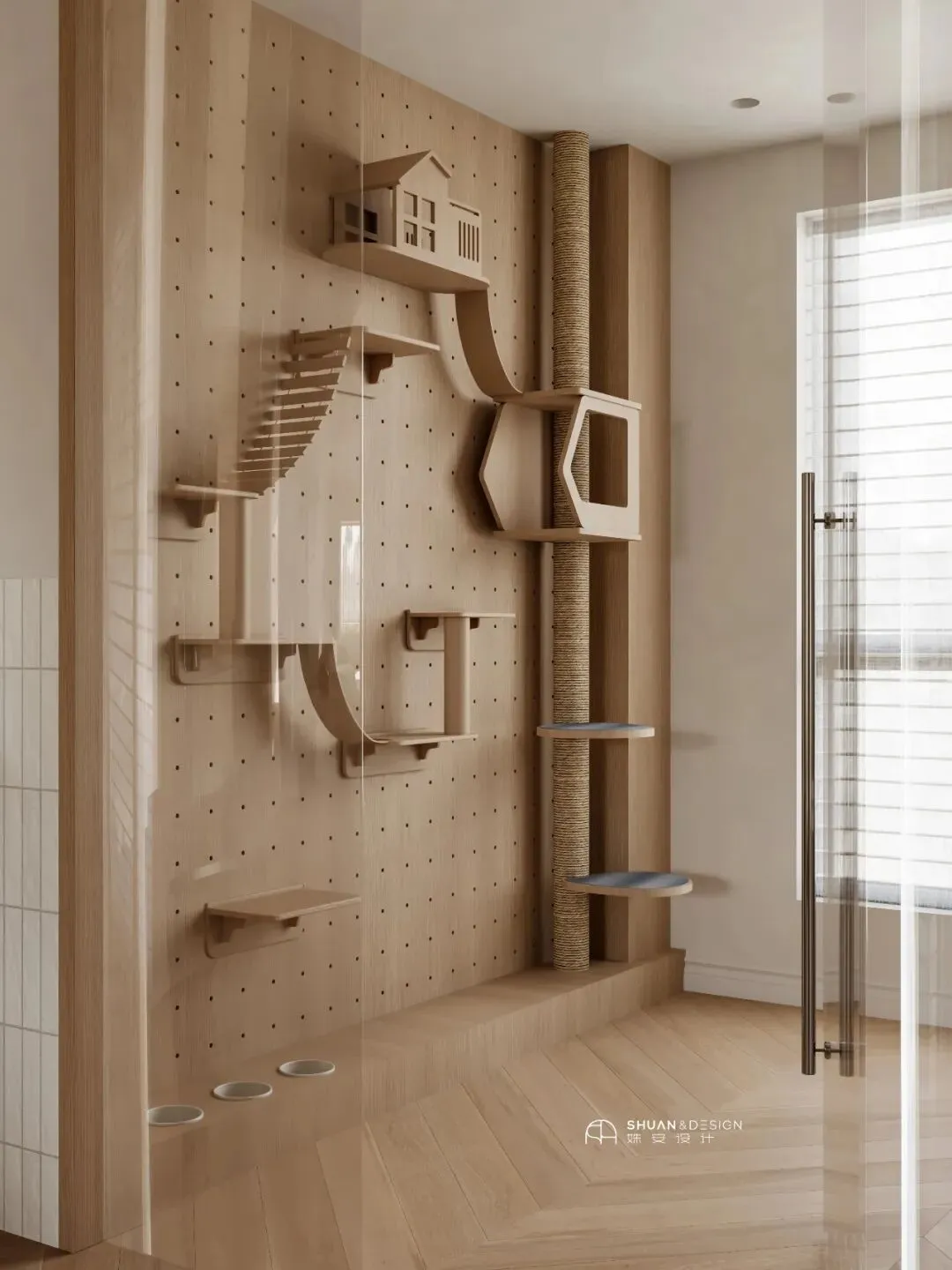 推开门,第一眼是「通透」,第二眼是温柔。LDK一体化设计,打通了所有隔阡,形成流畅的「Flow」。孩子可以骑着滑板车从客厅滑到餐厅,而你无论在哪个角落,一抬头,总能看见家人。这种「Connection」,是空间给予生活最好的礼物。墙面是留白:简约石膏线条,不是装饰,而是为未来生活留下的「Blank Space」。最戳人的,是阳台那面玻璃猫房。设计师把最好的阳光留给了猫咪,而猫咪慵懒的身影,则成了家里最灵动的「Living Art」。这个细节告诉我们:真正的高级,是容纳每一个生命的「Love」。02 / Heart of the Home