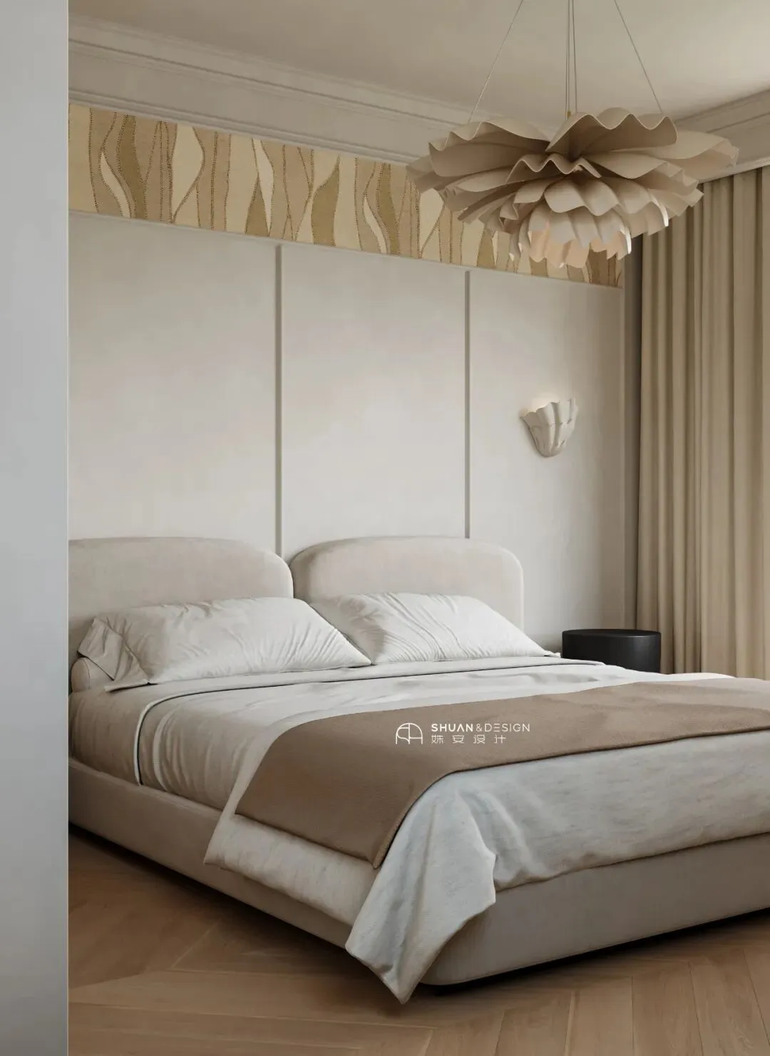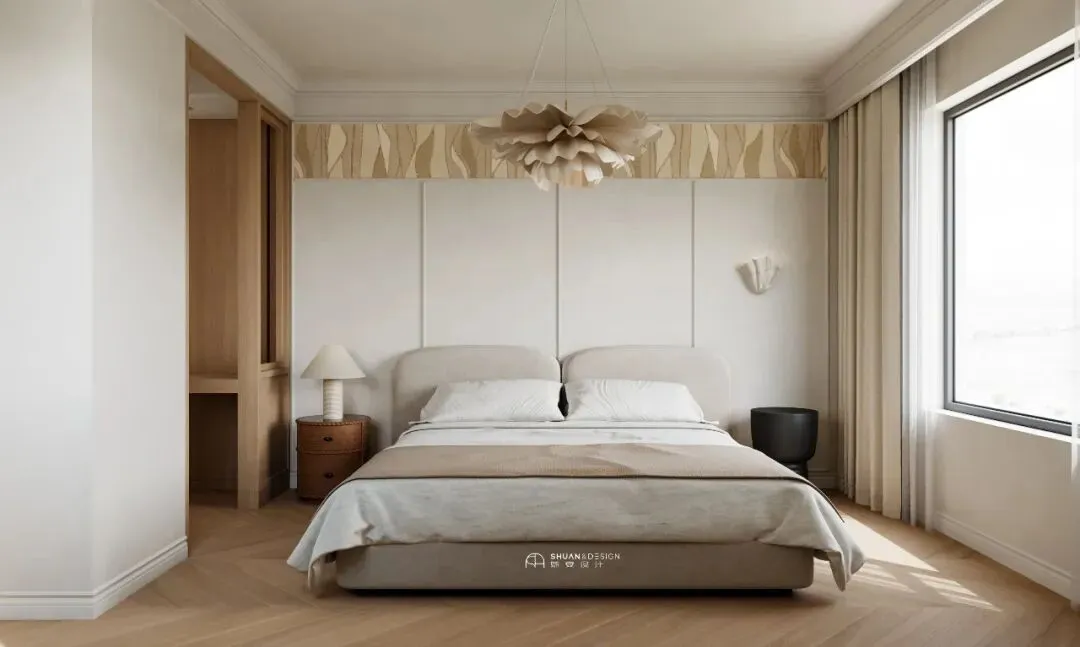 进入卧室,就像按下了「Silent Mode」。浅米色软包床头,温柔地承托着疲惫的身体。设计师的小心思藏在头顶:花纹壁纸与花朵吊灯,当灯光亮起,仿佛有花瓣飘落,伴你入眠。这里没有烦恼,只有一场好觉——「Sweet Dreams」。看完这个家,你会发现,它并没有多么豪华的建材,也没有多么夸张的设计。它之所以动人,是因为它回答了每个刚需家庭最核心的困惑: