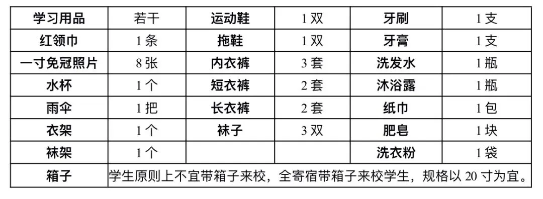 ⑤新生入学教育期间,所有学生一律住宿,需准备以下生活用品。开学后因学校住宿条件有限,同学们可自愿选择走读、午休或全寄宿。