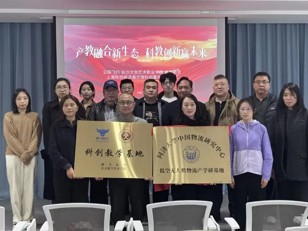 活动中,长沙文创艺术职业学院理事长黄平、蜂飞航空董事长谢胜强与上海低空经济馆云际飞行总裁阮航共同签署《深化科教创新基地建设合作协议》,并为“科创教学基地”揭牌。同时,同济大学中国物流研究中心与上海低空经济馆合作的“同济大学中国物流产学研基地”也一并落地。