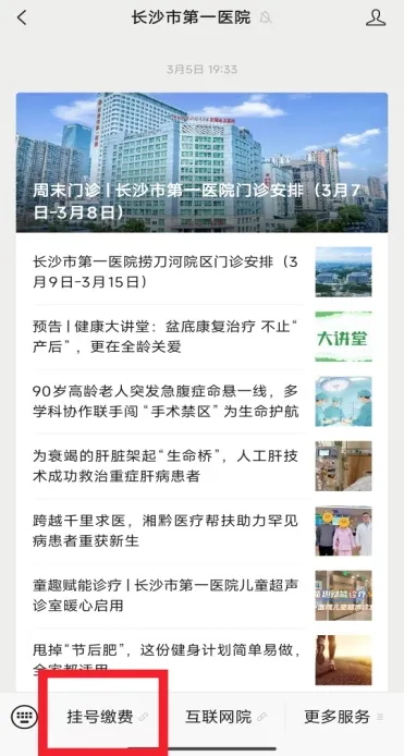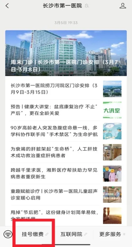1.请提前关注“长沙市第一医院”微信服务号,完成就诊人绑定,绑定成功后获取便捷高效的服务。