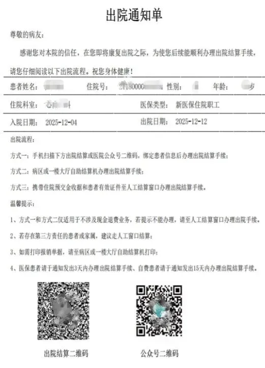 患者或家属可扫描出院通知单(由病区护士站打印)上的出院结算二维码,即可直接办理出院结算手续。
