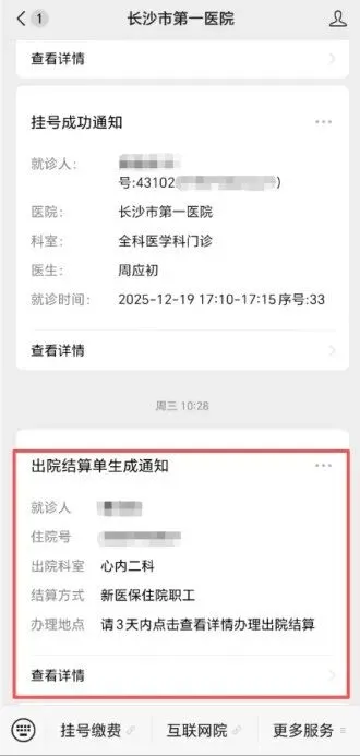 医院会通过微信医院服务号向绑定就诊人推送出院结算通知,只需点击通知中的“查看详情”,正确输入患者信息即可跳转至结算页面完成办理。