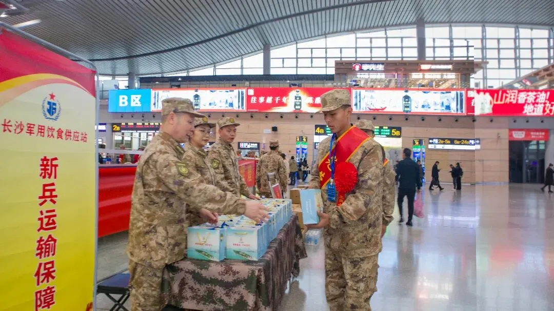 上午9时,长沙高铁南站候车大厅内,数百名新兵身着崭新戎装、胸戴大红花,即将奔赴祖国各地开启军旅生涯。在候车区的新兵运输保障点前,长沙军供站的工作人员正有序将定制“能量包”递到新兵手中。“能量包”内容丰富,颇具“长沙味”:印有“长沙军供”标识的定制饮用水,承载着来自故乡的问候;“茶颜悦色”奶茶包,让即将离乡的年轻战士们,在舌尖上留住一抹熟悉的“星城甜”;精心搭配的梅子、饼干和坚果,则寓意着军旅生涯“梅”有烦恼,建功立业“果”然精彩。一位新兵接过“能量包”感动道:“没想到出发前还能喝到家乡的奶茶,这个味道太亲切了!”