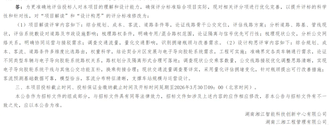 根据招标公告,长沙第一条智轨线路规划:起于地铁 3 号线洋湖公园站,到人工智能科技城・湘江智谷,全长约 10 公里,总投资 3 亿元。计划 2026 年 3 月底完成方案设计招标,4 月 6 日开工,2027 年 4 月 6 日交付。