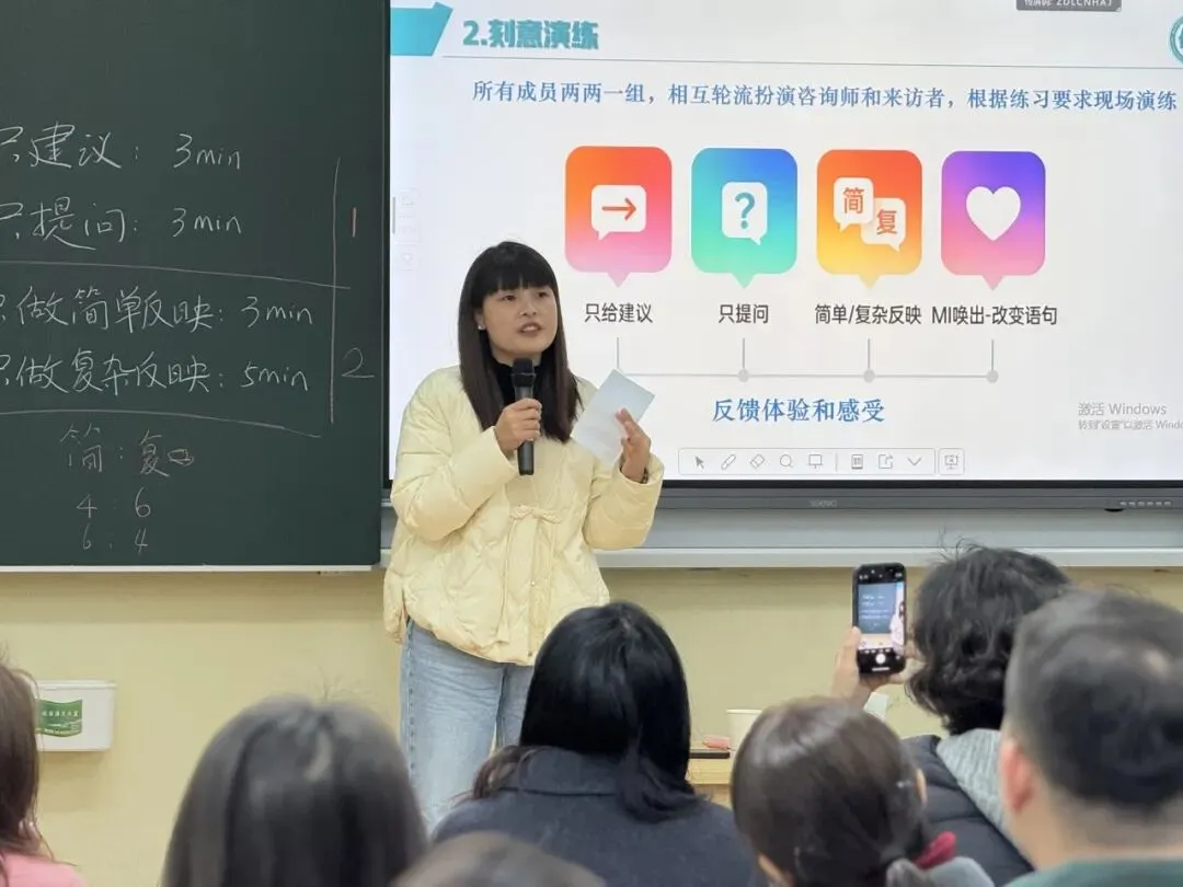 我校心理健康教研组长文芳担任带练老师,带领全市参训教师开展多维度实操练习。现场演练聚焦真实案例,在角色互换与情境模拟中精准打磨技术细节,让理念真正落地生根。