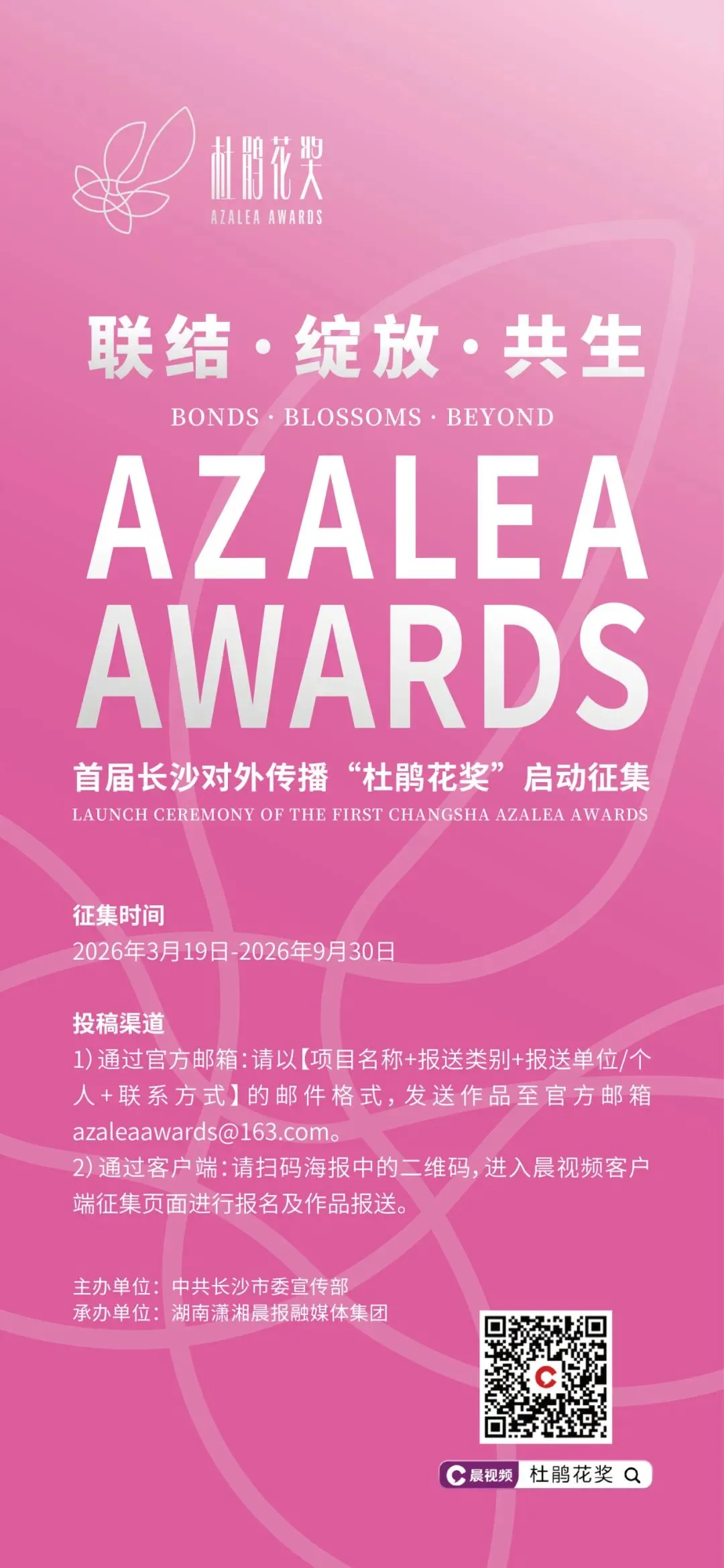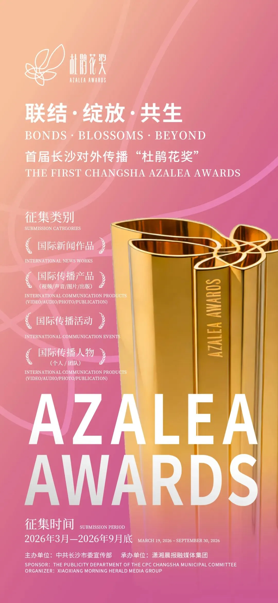 本次评选将经过资格初审、专家评审两大环节,围绕导向性与价值性(30%)、国际传播力与影响力(30%)、创新性与专业性(25%)、“杜鹃花奖”长沙特质(15%)四个维度进行综合评定。为保障奖项权威性与专业性,“杜鹃花奖”组建了“国际 + 学界 + 业界”三轨专业评审委员会,共同打造长沙市国际传播最高荣誉。