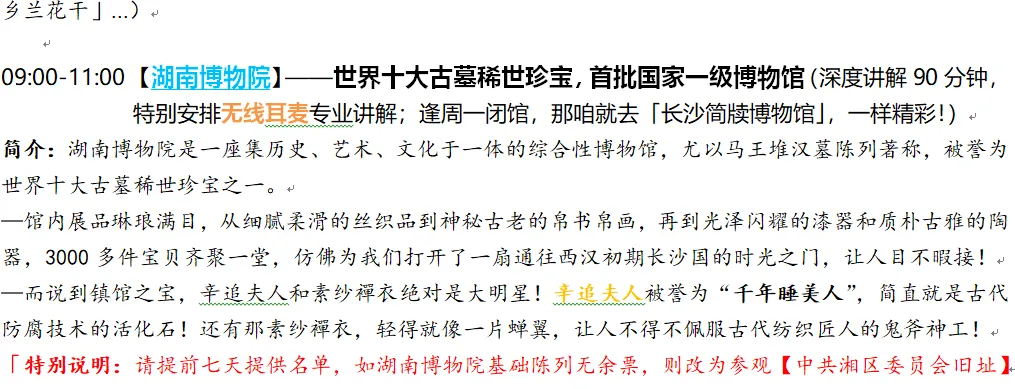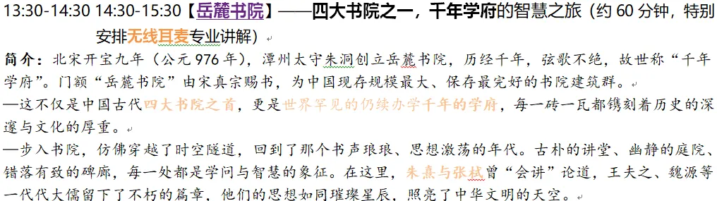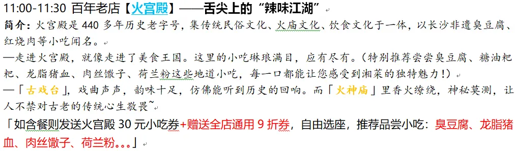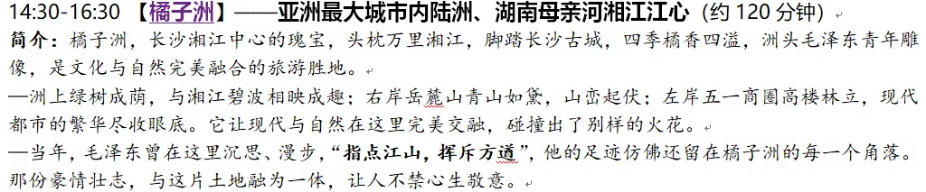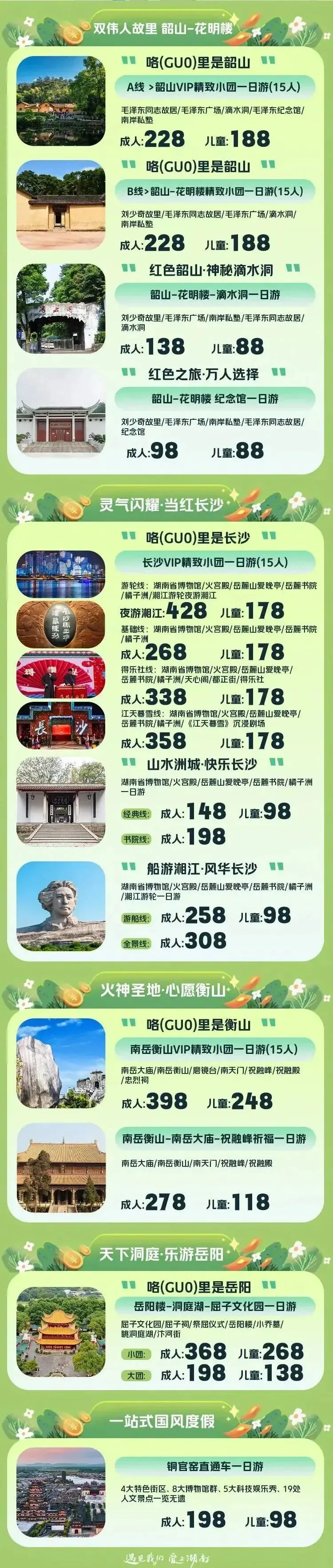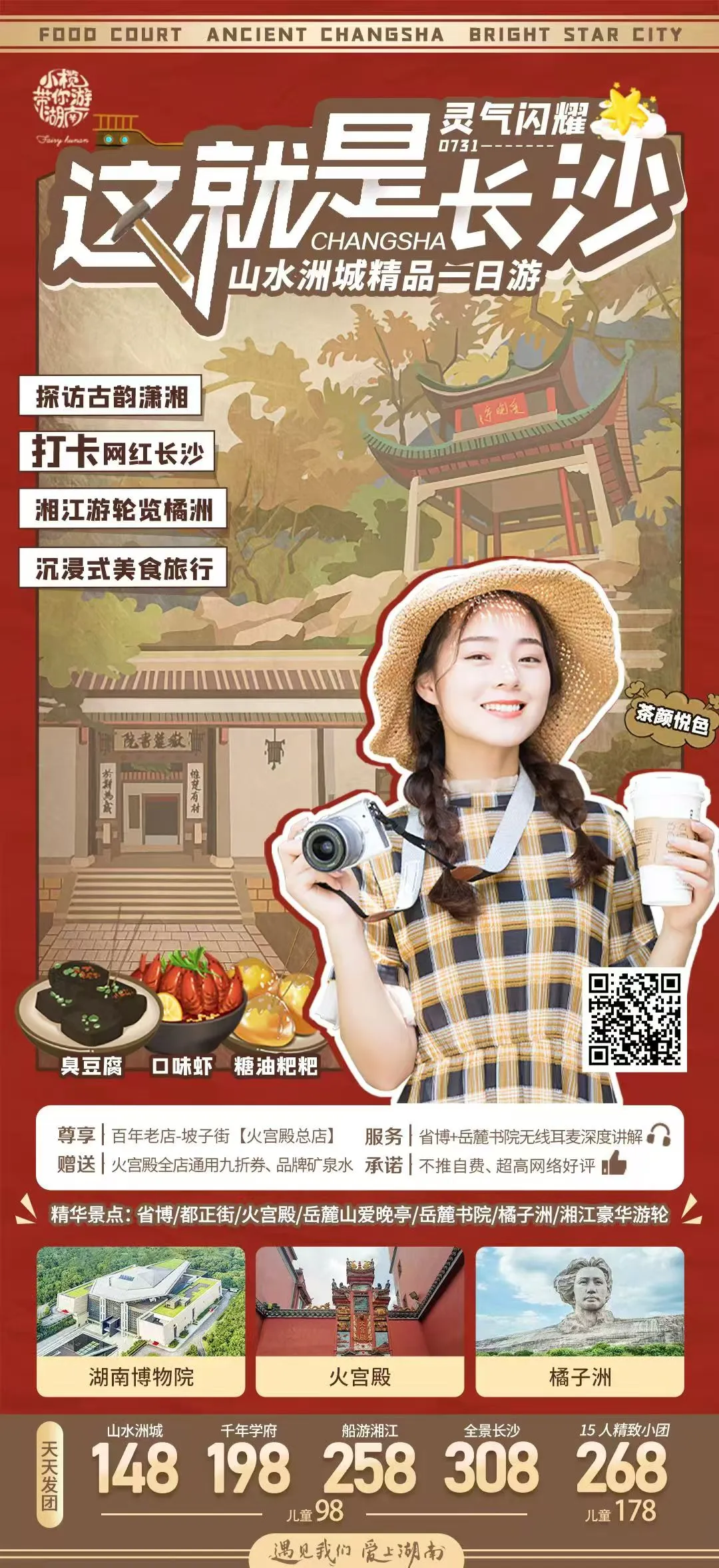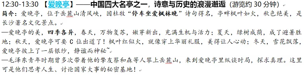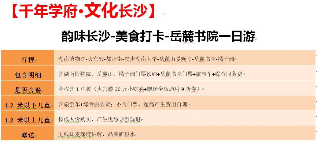 🍀费用包含:含1天旅游车费+岳麓山、橘子洲、湖南省博物馆门票预约+岳麓书院门票+中餐(火宫殿30元小吃券+赠送全店通用9折通用券)+导游服务+保险