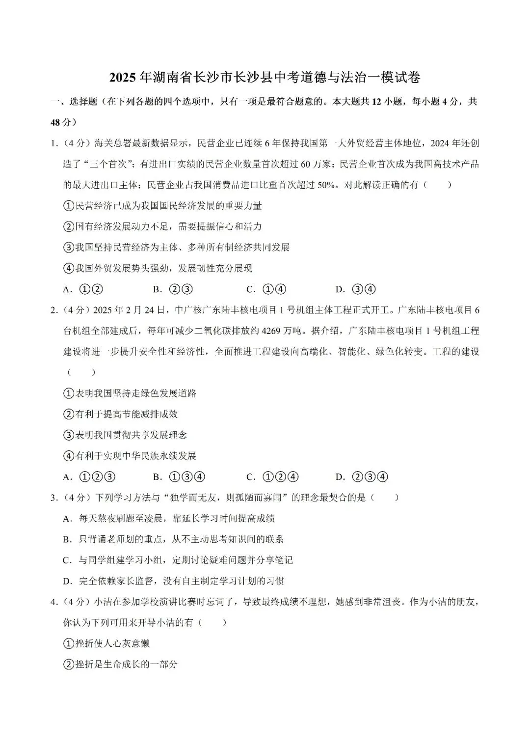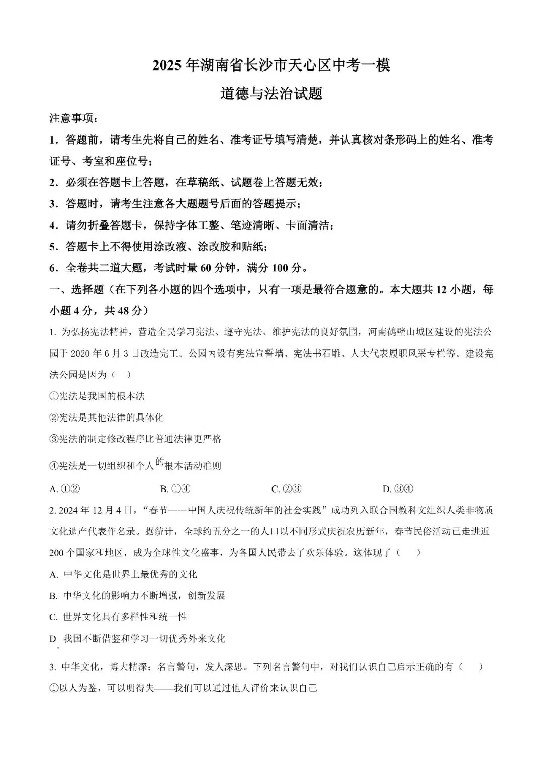【真题汇总】——2025年长沙九年级下册中考一模数学试卷+参考答案(免费领取)