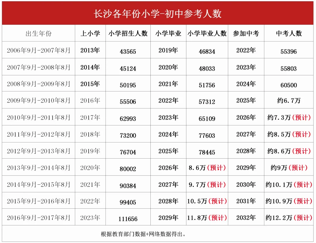 2010-2018 年的生育高峰,直接影响着当下的升学格局 ——2025 年升入初中的孩子,大多是 2012-2013 年出生的群体。结合长沙此前小学入学人数的推算数据,未来几年小升初人数仍将保持持续增长态势,这场升学 “洪峰” 的顶峰预计将在 2029 年到来。