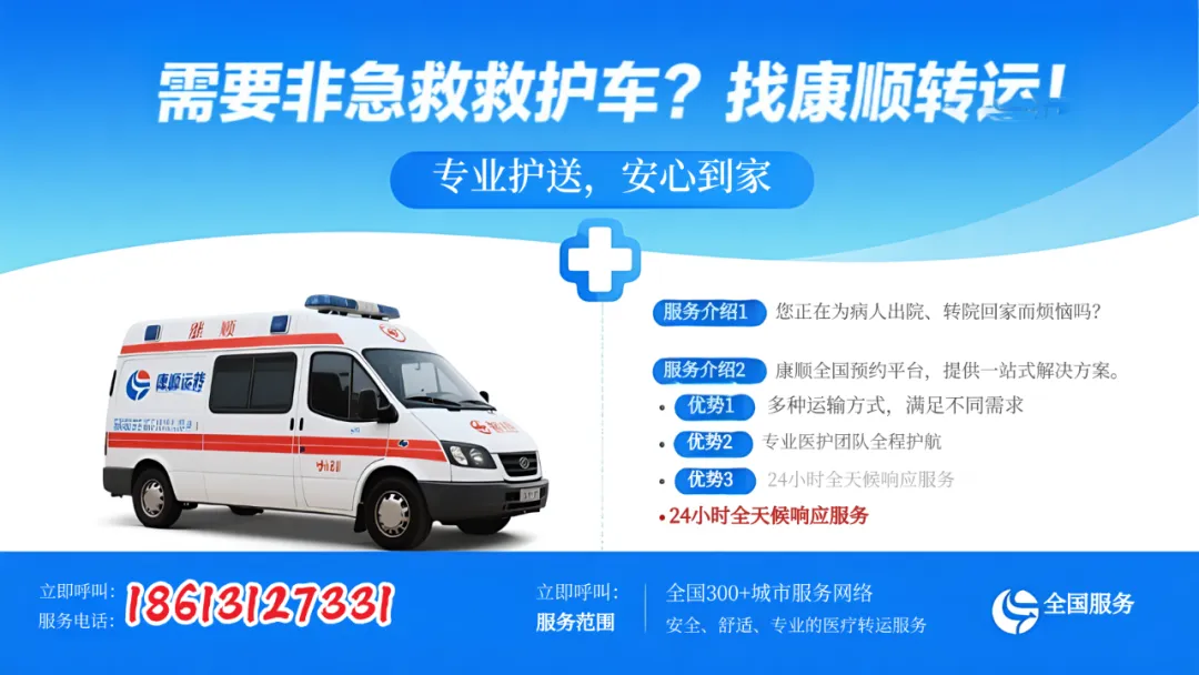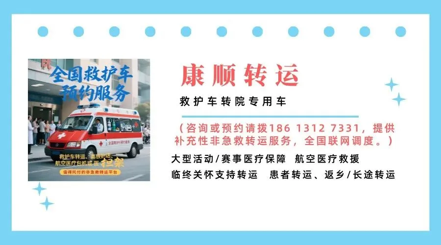 康顺转运24小时服务热线:186 1312 7331(微信同号,长按复制添加咨询),作为正规资质的非急救医疗转运服务商,正是为此而生。我们不是120,但我们以同等专业,专注服务于 120急救之后 的生命旅程。