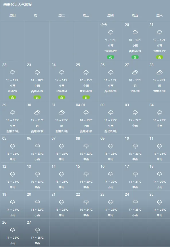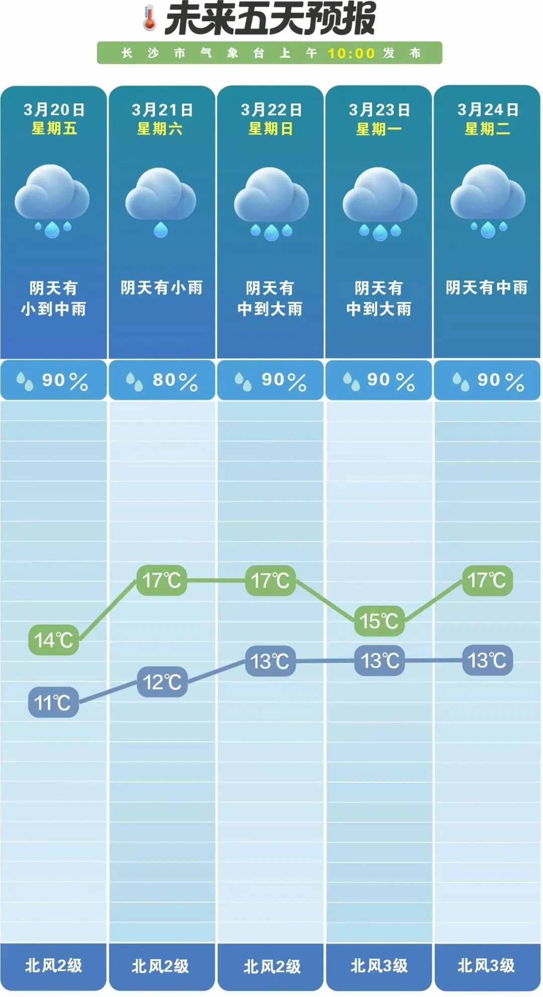 不过这一个礼拜的雨倒是实打实的。市气象台预报,从20日到24日,长沙天天有雨。3月20日春分这天,预报是“阴天有小到中雨”,北风2级,11℃到14℃。