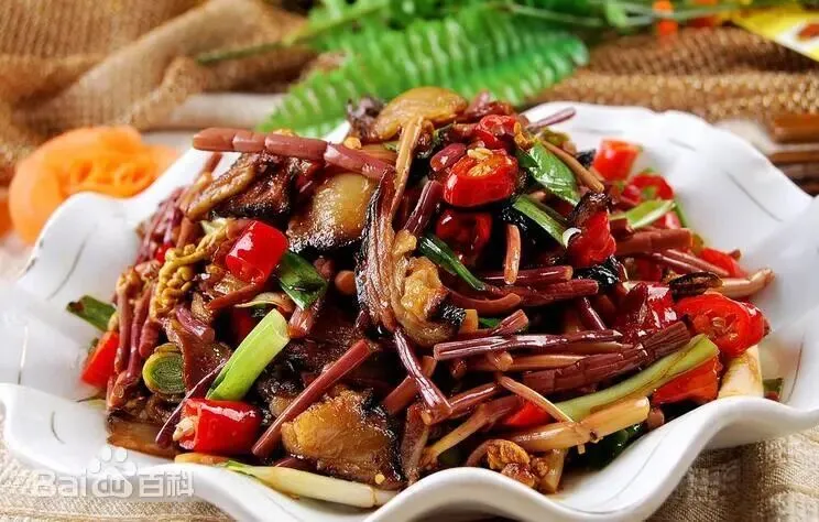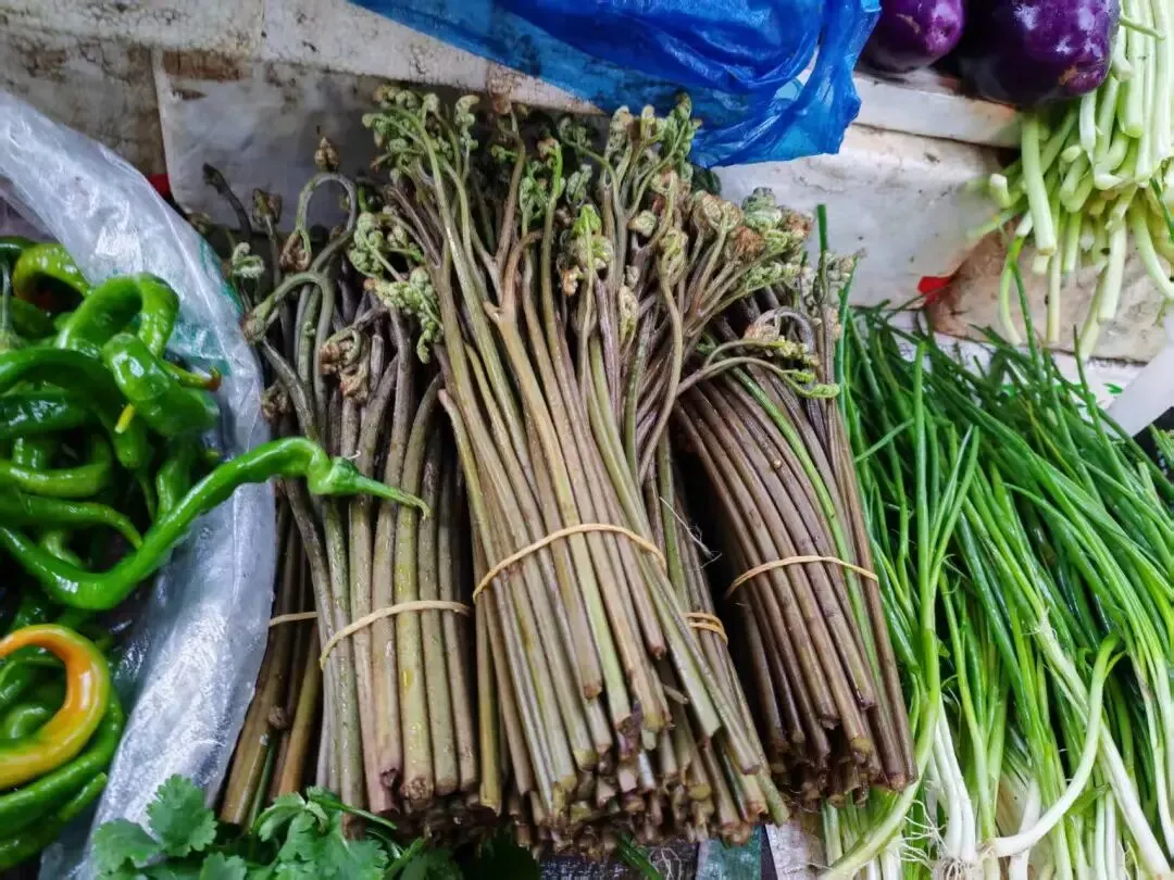 蕨菜炒腊肉,是春天必吃的。蕨菜刚从山里挖出来,嫩嫩的,带着一股清香。腊肉切薄片,和蕨菜一起炒,蕨菜吸了腊肉的油,腊肉染了蕨菜的香,下饭得很。