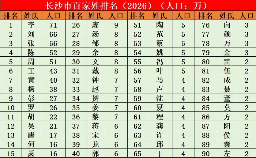 百家姓排名(2026): 哪个省会城市人口最多?长沙排第8
