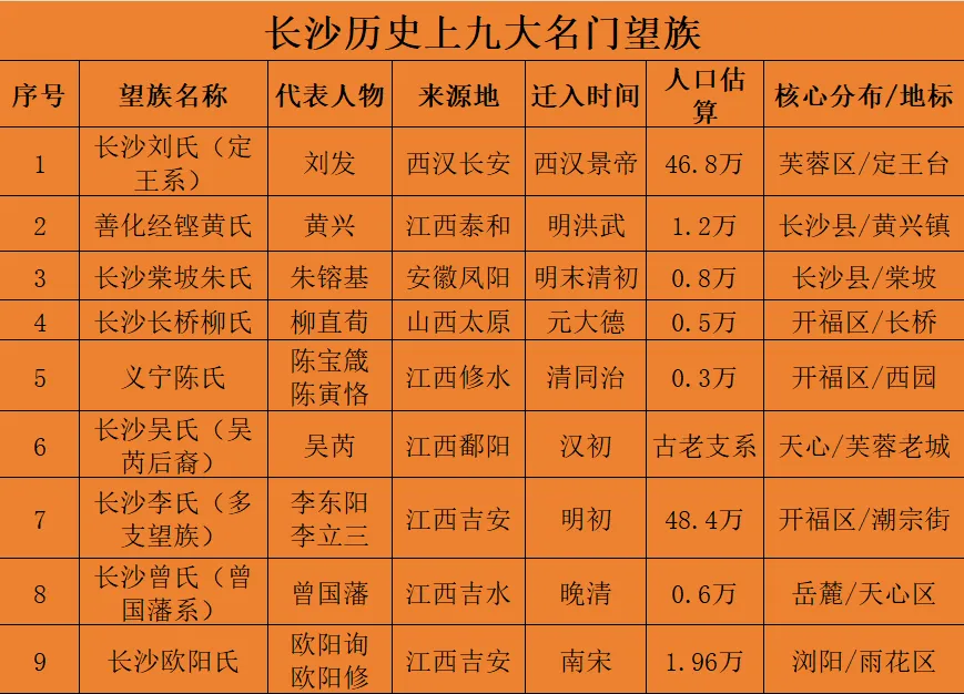 人口最多的前十大姓氏占据了全市近四成人口,依次为:李 (约占7.05%,居首位)刘、张、陈、周、王、黄、杨、彭、罗。据《千年百姓:从族谱中解读长沙姓氏》一书记载,长沙历史上的九大名门望族,构成了姓氏人口的主体框架,撑起了长沙的文脉脊梁。(您的家族是否在九大望族之列?)