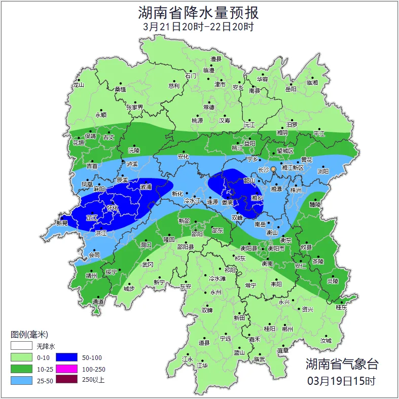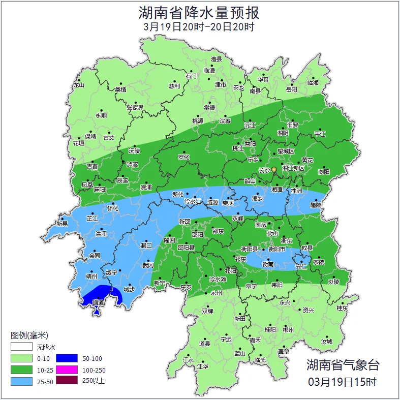 3月20日白天,全省阴天有小到中雨,其中湘中部分地区大雨,怀化(通道)、邵阳(城步)暴雨;北风2~3级;最低气温湘西8~11℃;最高气温湘南15~18℃,其他地区12~14℃。