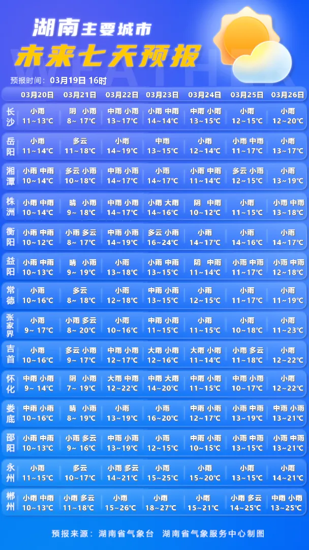 湖南主要城市未来七天预报