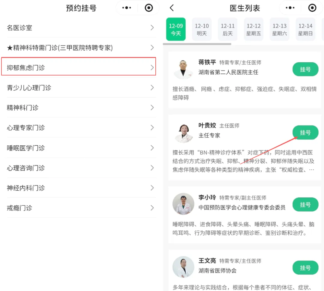 医院官方小程序:搜索『长沙华兴医院精神心理科』小程序,依次点击:门诊挂号-抑郁症门诊-挂号