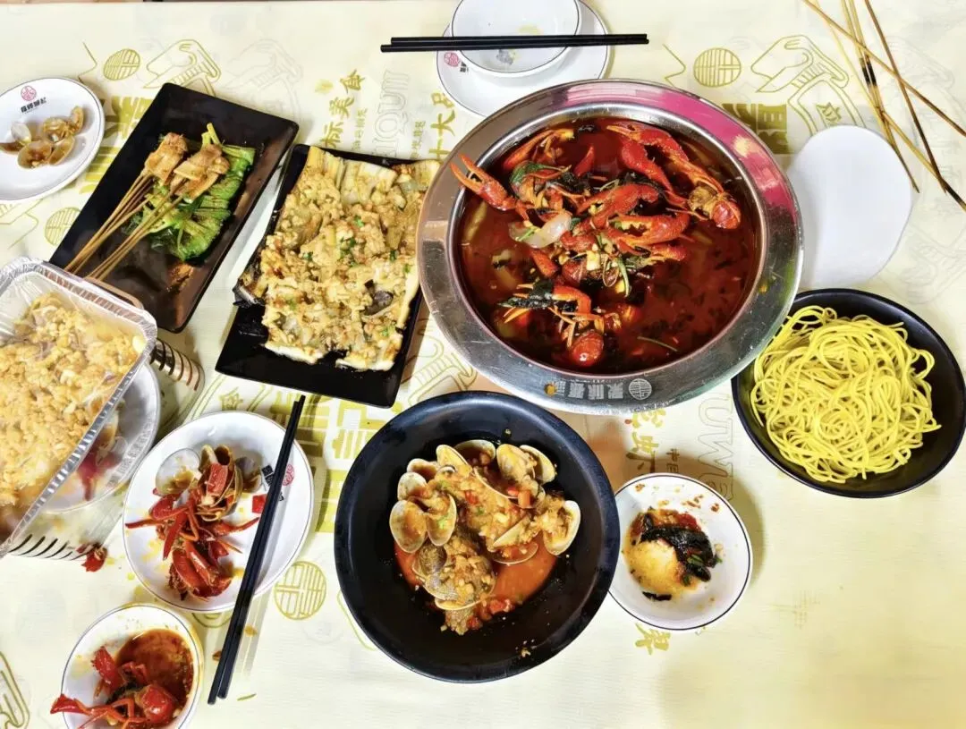 那碗“被虾加持”的碱水面,让人痴迷。黄澄澄的面条堆在黑碗里,像一盘金色的瀑布,拌进小龙虾的汤汁里,面条吸饱了辣油和蒜香,每一根都弹牙入味。我兴奋地说:这才是美味!哥哥和小吴笑我“吃面比吃虾还认真”。