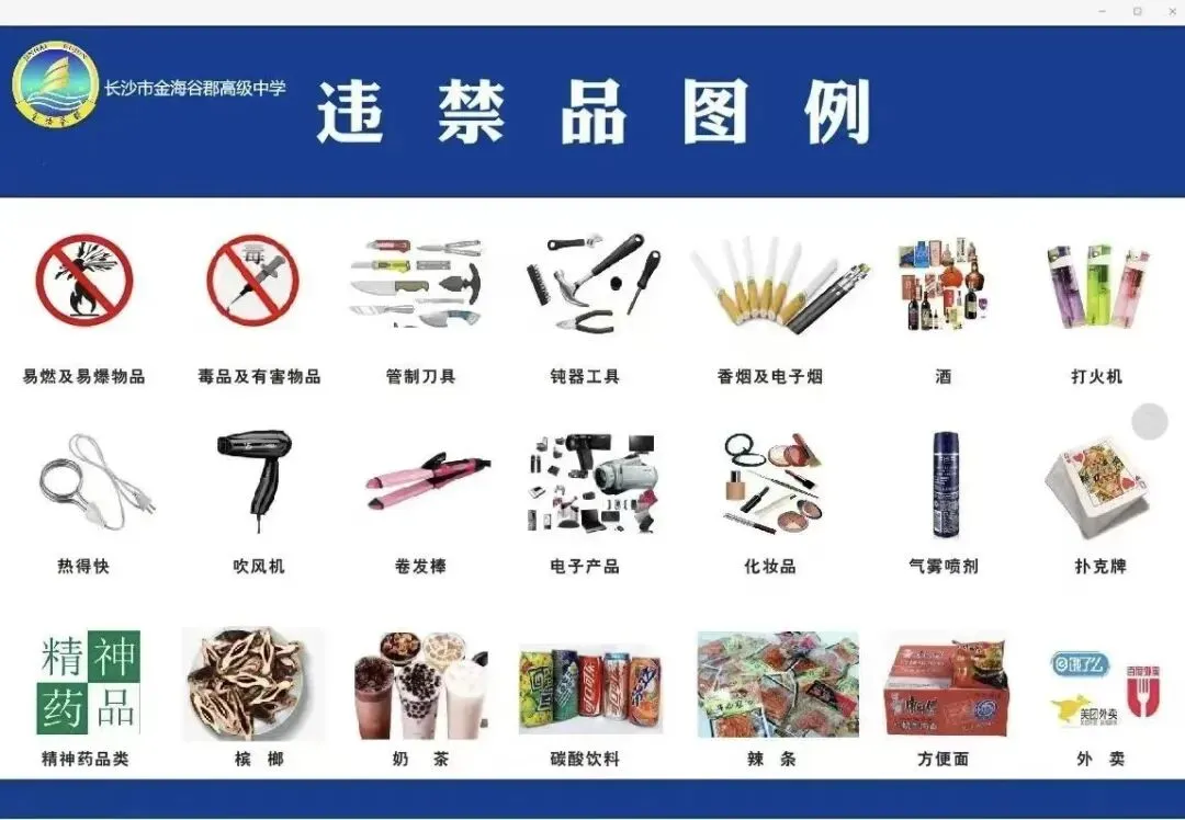 3. 所有学生禁带的物品:(1)台灯、手电筒、MP3、充电设备、小电风扇、平板电脑、手机(电话手表和翻译笔)等电子产品,电吹风统一放生活老师处保管使用;(2)牛仔裤、奇装异服、首饰、化妆品;(3)烟酒、槟榔、方便面、口香糖、麻辣、瓜子花生及易燃易爆物品、管制刀具等危险品;(4)面膜、香水、各类饰品、布娃娃等和各类健身器械不能带入寝室。严禁任何学生携带以上物品进入校园。