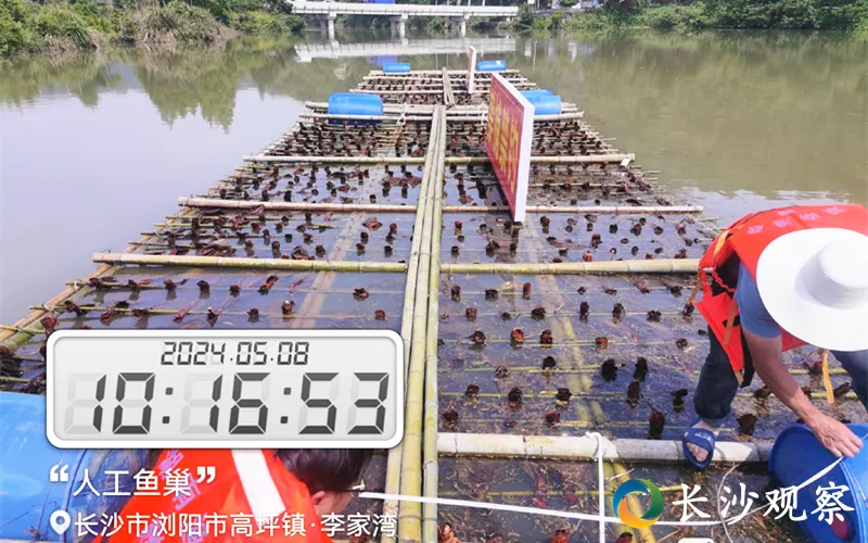 ▲浏阳河上的“人工鱼巢”。