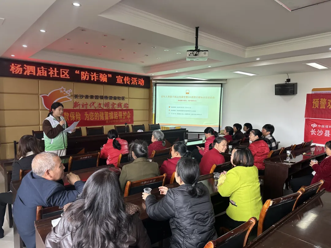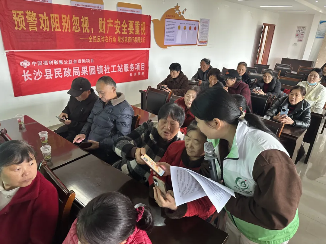 3月19日,在"星沙有爱·益路同行"品牌引领下,长沙县果园镇民生事务办、镇社工站联合杨泗庙社区、星沙农商银行果园支行,开展老年人智能手机运用暨315消费维权宣讲活动,50余名社区老人参与。